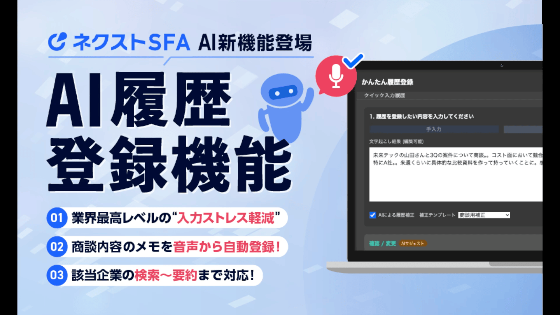 「AI履歴登録機能」なら、手入力や音声をAIが自動補正。