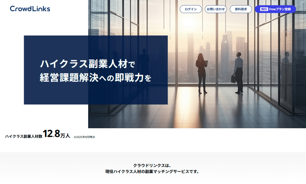 副業マッチングサービスで知名度の高い株式会社クラウドワークスが提供する顧問紹介サービス「クラウドリンクス」。クラウドワークスは職種を限定しない総合型のクラウドソーシングプラットフォームですが、クラウドリンクスはトップ企業出身の人材に特化しています。