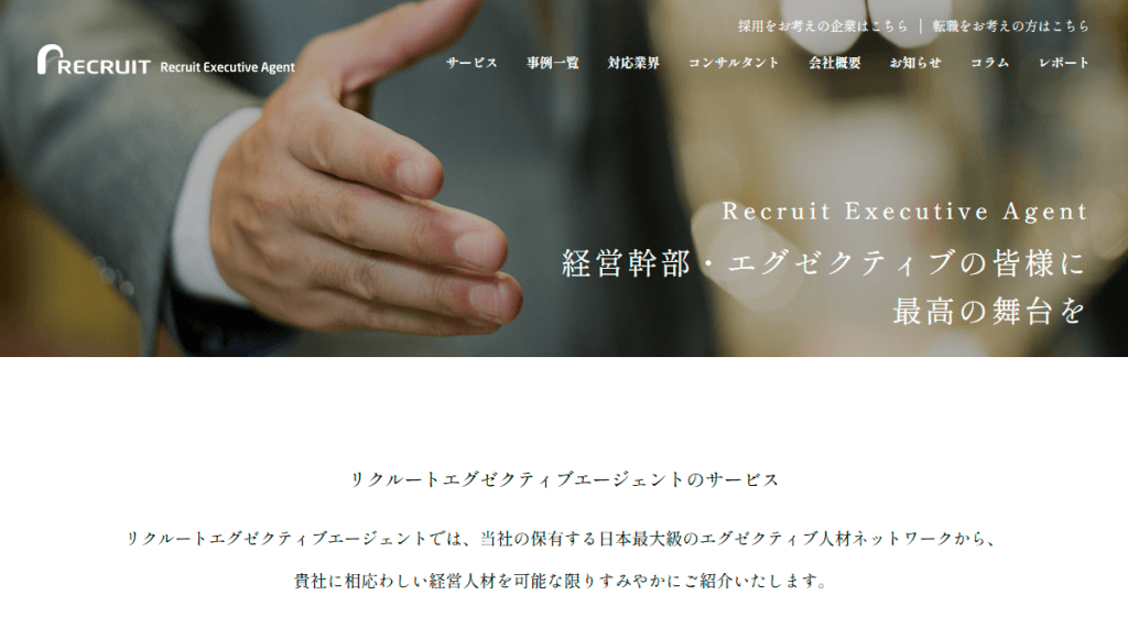 株式会社リクルートが運用している「リクルートエグゼクティブエージェント」は、経営幹部やエグゼクティブ層に特化した人材紹介サービスです。