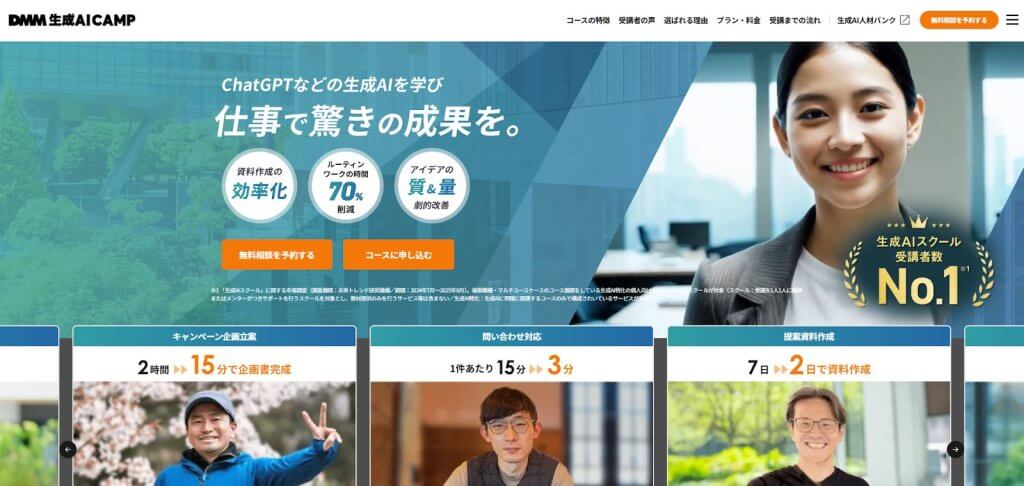 「DMM生成AI CAMP」は、DMM.comグループの株式会社インフラトップが提供する、ビジネスパーソン向けのAIスクールです。ChatGPTを中心に、業務活用に直結する実践スキルを学べます。
