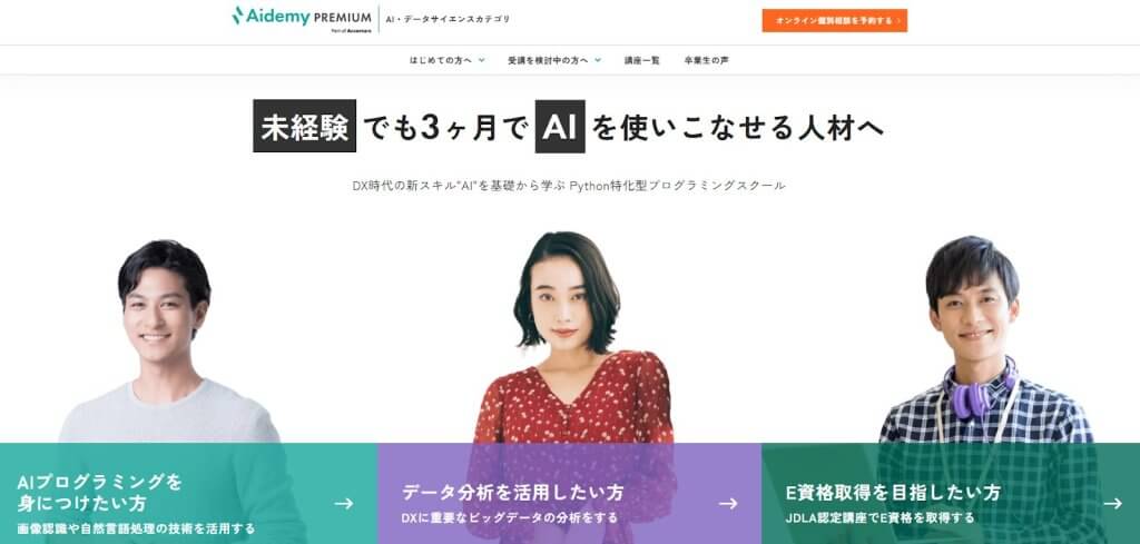 「Aidemy Premium」は、株式会社アイデミーが運営するAIスクールです。Pythonによるデータ分析や機械学習に加え、生成AIの実践スキルも学べます。動画教材・コード演習・添削サポートがそろっており、基礎から応用までを一貫して学習可能です。
