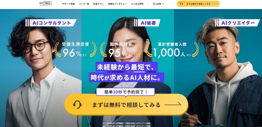 - ChatGPTや画像・動画生成AI、ノーコードツールなど、今すぐ使える技術を最短1カ月で学べるカリキュラムを提供