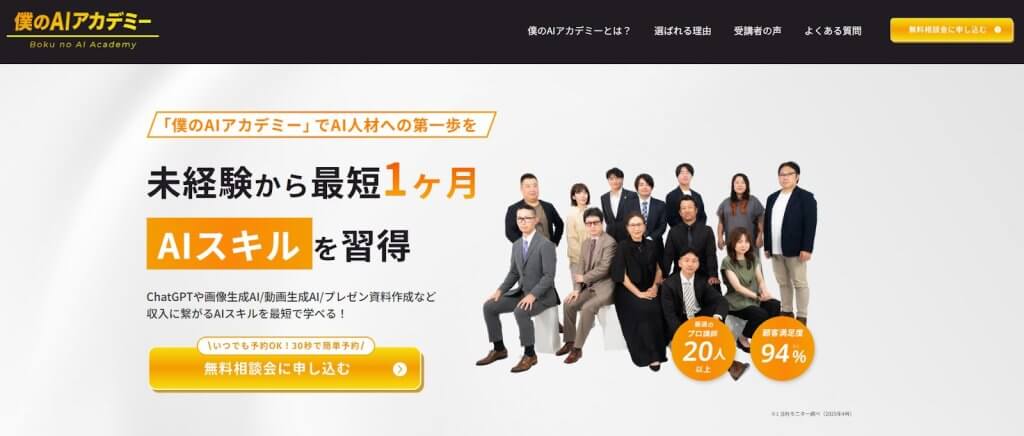 「僕のAIアカデミー」は、AI初心者向けに設計されたオンラインスクールです。ChatGPTやCopilotなどを使った業務効率化をテーマに、実践的な講座を提供しています。実際の業務シーンを想定した課題を通して、AIツールをどのように使うかを体験的に学習可能です。