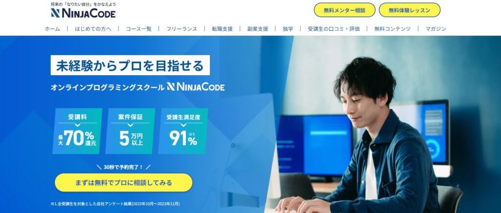 - 45,000人の指導実績を基にしたオリジナルカリキュラム、現役エンジニアによるマンツーマン指導、疑問点即対応できるサポート体制