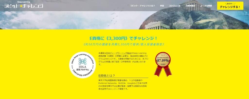 「ラビットチャレンジ」は、Study-AI株式会社が提供するオンライン学習プログラムです。東京大学松尾豊教授が理事を務める、高度なAI技術者を証明するエンジニア資格「E資格」を取得するために必要なプログラムを学べます。