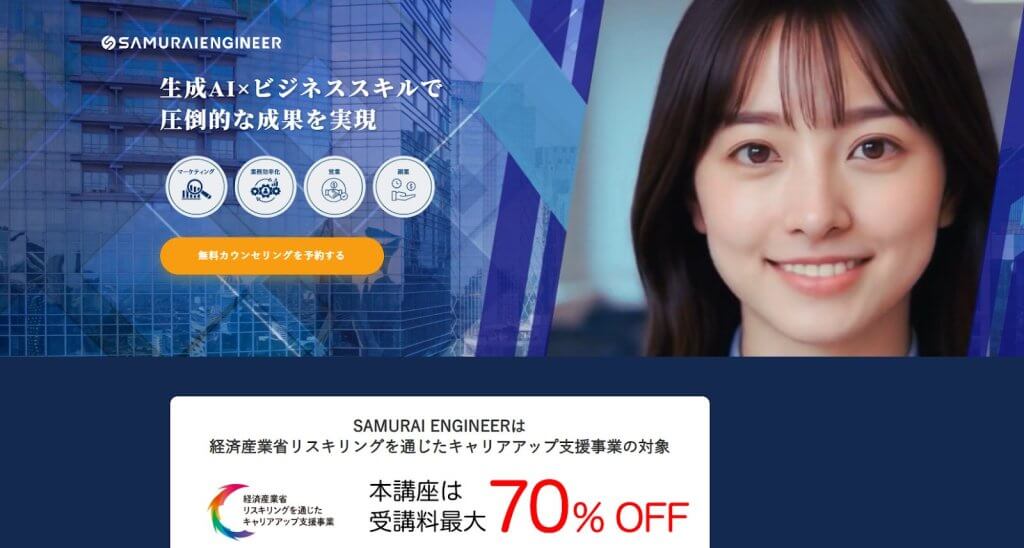 「侍エンジニア」は株式会社SAMURAIが運営する、AIスクールです。生成AIの活用法から始め、目的に応じたスキルが身に付きます。生成AIの活用法はもちろん、ExcelやGoogleスプレッドシートを活用した業務効率化の手法も習得可能です。