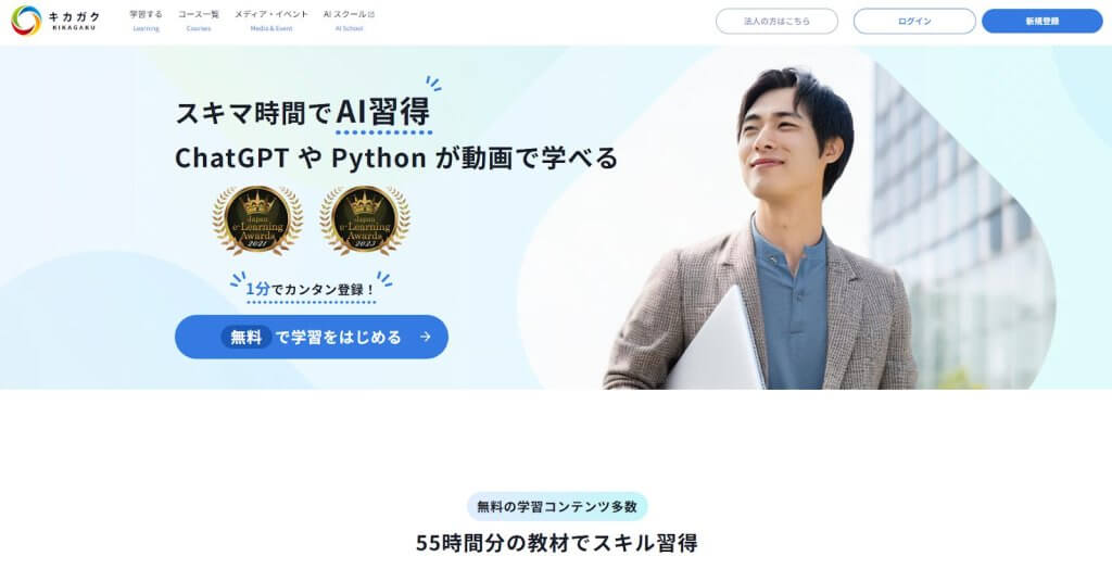 「キカガク」は、株式会社キカガクが提供するAIスクールです。AI・機械学習分野の教育実績が豊富で、生成AIの活用スキルも体系的に学べます。ChatGPTを中心に、業務効率化・資料作成・画像生成など、実務に直結する内容がそろっており、法人研修にも多数採用されています。