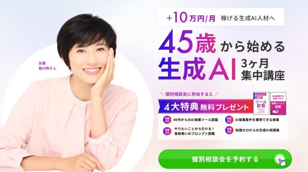 | コース内容 | ・生成AI基礎実践コース ・生成AIマーケティング実践コース ・生成AI営業実践コース ・生成AI業務自動化コース ・生成AI ×WEB副業コース |