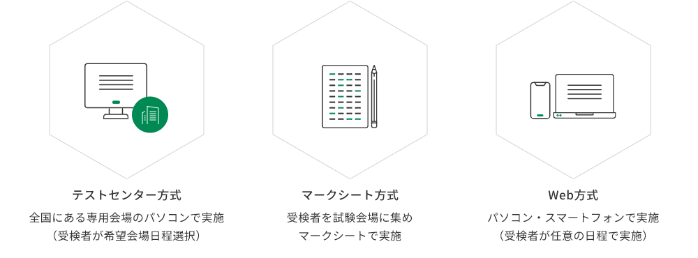 | 試験方式 | ・マークシート方式 ・テストセンター方式 ・Web方式 |