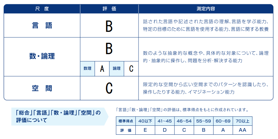 知的能力は、いわゆる地頭力を測る項目です。言語/数・論理/空間の3つに分かれています。「AA/A/B/C/D/E」の6段階で、評価が表示されます。