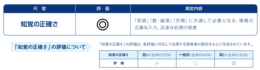 知覚の正確さは、情報を正確に入力できるかどうかを測る項目です。「◎(全体の30%)/〇(全体の40%)/△(全体の30%)」の3段階で評価されます。