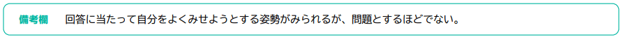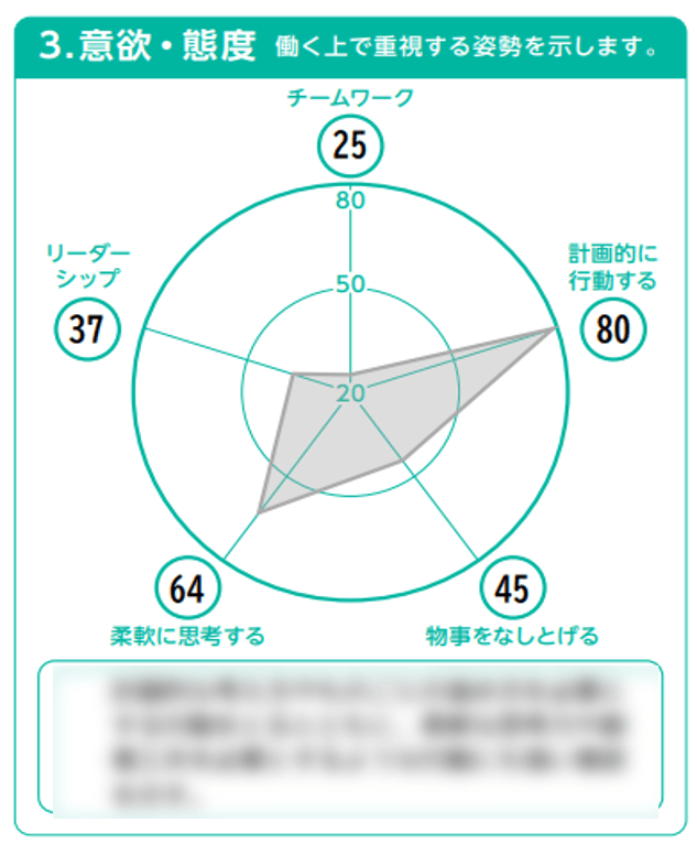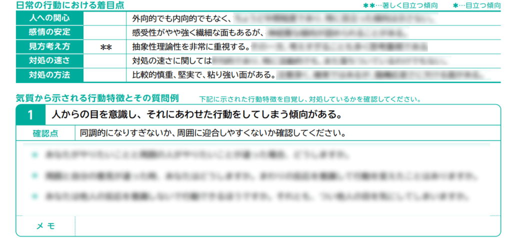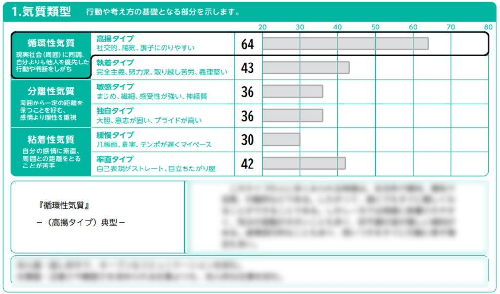 気質類型は受検者固有の考え方や行動パターンといった先天的な気質を測るもの、性格特徴は日常での行動傾向を測るもの、意欲態度は職場での姿勢などを測るものです。また備考欄では、回答の信頼性やストレス傾向などを把握できます。