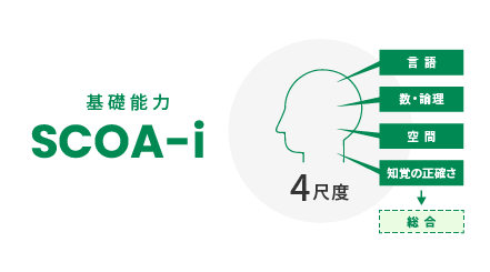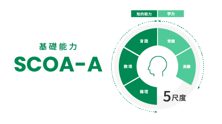SCOA-Aは、知的能力(地頭力)と学力をバランス良く測定できる適性検査です。言語・数理・論理・一般常識・基礎英語の5つの尺度で、受検者の基礎能力を測定できます。