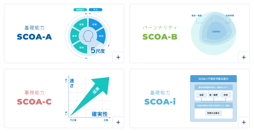 SCOA総合適性検査には複数のラインナップがあり、言語や数理、論理といった先天的な基礎能力から、一般常識や基礎英語といった後天的に身に付く学力まで、バランス良く測定可能です。さらに受検者のパーソナリティや事務能力を測る検査も用意されています。企業のニーズに合わせた適性検査を自由に選択できる点がポイントです。