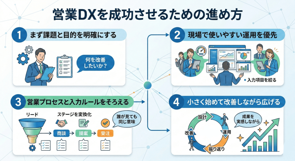 営業DXは大きく見えるが、実際は小さく始めて改善しながら広げるほうが進みやすい。