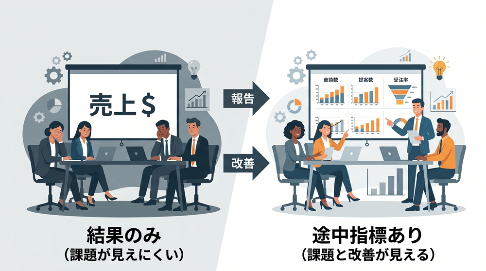 この違いを整理しておくと、営業会議でも結果だけを見るのではなく、その結果へ至る流れをどう確認すべきかが見えやすくなります。