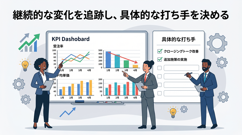 KPIが整理されていれば、商談数の不足、提案件数の停滞、受注率の低下、案件数の偏りなどを見ながら、どこに問題があるのかを把握しやすくなります。