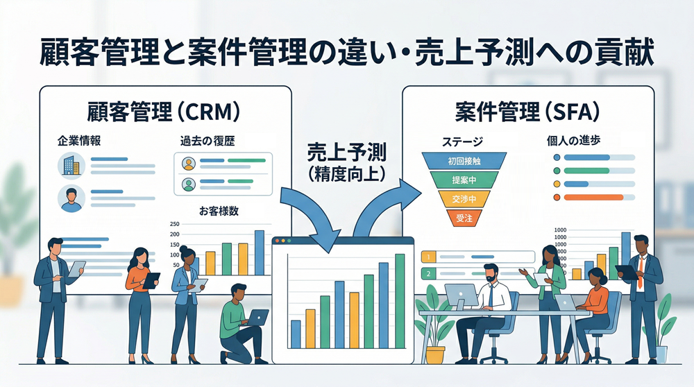 一方で案件管理は、今動いている商談ごとの進捗や受注確度、提案内容、次回アクションといった、売上に直結する情報を扱います。