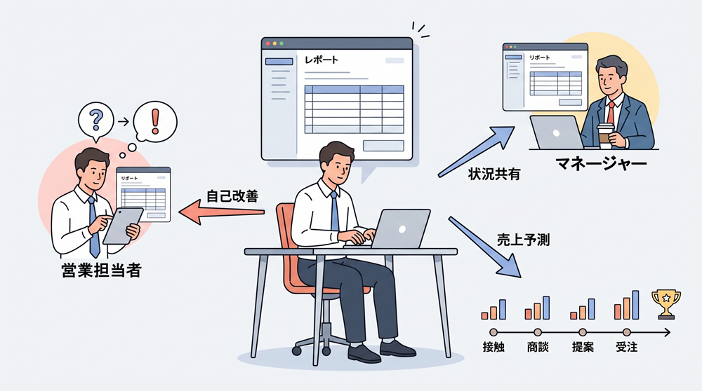 営業担当者自身が自分の活動を振り返り、次の改善へつなげるための役割も持っています。