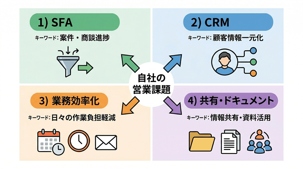 案件管理が曖昧なのか、顧客情報が散在しているのか、営業担当者の事務負担が重いのかによって、選ぶべきツールは変わります。