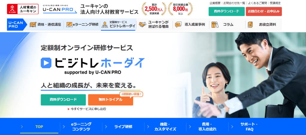 「ビジトレホーダイ」は、株式会社ユーキャンが提供する階層別研修対応の定額制eラーニングシステムです。インプットとアウトプットを組み合わせた教育設計で、定着率の高い研修を実現します。