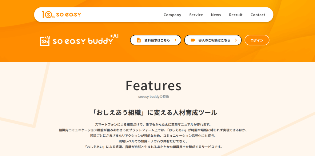 「so easy buddy」は、ノウハウの動画化とナレッジ共有に特化した社内向けeラーニングシステム・マニュアル動画ツールです。現場社員が投稿者となり、社内の“暗黙知”を動画で蓄積・共有できます。