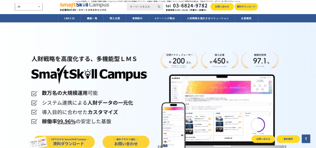「SmartSkill Campus」は、月間アクティブユーザーが約200万人にのぼる大規模eラーニングシステムです。豊富な利用データを活かした改善により、高い学習効果を実現しています。