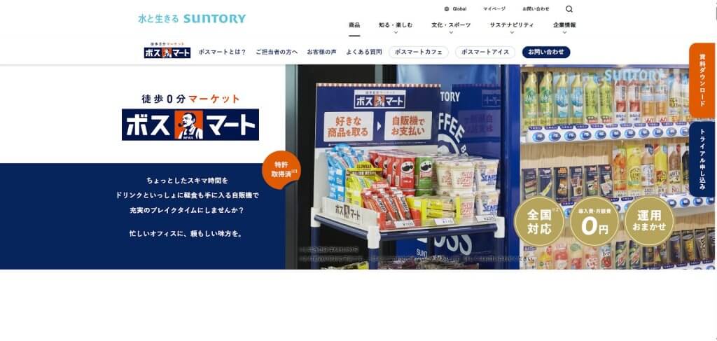 サントリーの飲料自動販売機と商品棚をセットで設置する新しいタイプのサービスです。棚から好きなお菓子やパン、カップ麺などを取り、支払いは横にある飲料自販機で行います。初期費用や月額費用が原則無料で導入できる手軽さが魅力。飲料と軽食をワンストップで購入できるため、休憩時間の満足度を向上させます。既存の自販機スペースを有効活用したい企業や、コストをかけずに福利厚生を充実させたい企業におすすめです。