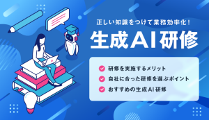 生成AIは、業務効率化や市場での競争力向上を実現する強力な手段ですが、社内での活用を進めるには、正しい知識と実践スキルを養うことが不可欠です。全社のAIリテラシーを底上げしたり、業務の自動化や効率化に必要なスキルを身に付けたりするには、生成AI研修の導入がおすすめです。