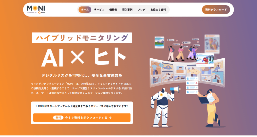 アディッシュは、スタートアップから上場企業まで、幅広い業種への導入実績がある企業です。風評被害をはじめ、炎上や誹謗中傷などのリスクから企業を守る「インターネットモニタリング」というサービスを展開しています。