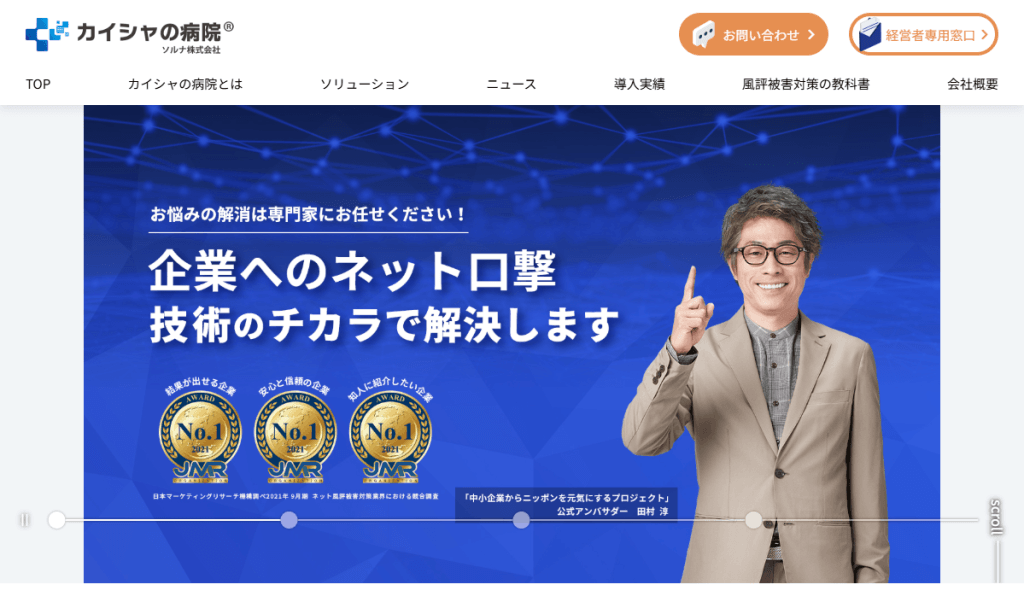 アスプロは、成果報酬型の風評被害対策企業です。サジェスト対策をはじめ、関連キーワードや見落としがちな画像検索の対策を行えます。逆SEOにより、ネガティブな内容のページの順位を下げたり弁護士と連携して書き込み者の特定を行ったりすることも可能です。また、独自の書き込み監視ツール「風評チェッカー」を用いて、常にサジェストや関連ワード、Twitterなどのチェックを行うこともできるので、炎上の火種を早期発見できます。
