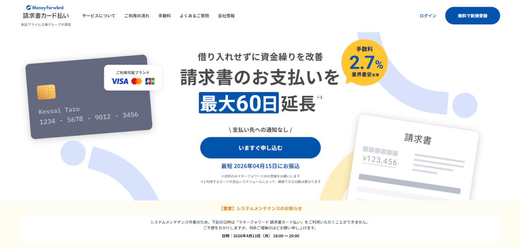 支払いにはすでに持っているクレジットカードを利用できるので、審査の必要がなく、手軽に資金繰り改善が目指せるのが特長です。企業はもちろん、個人事業主からも注目されているサービスです。
