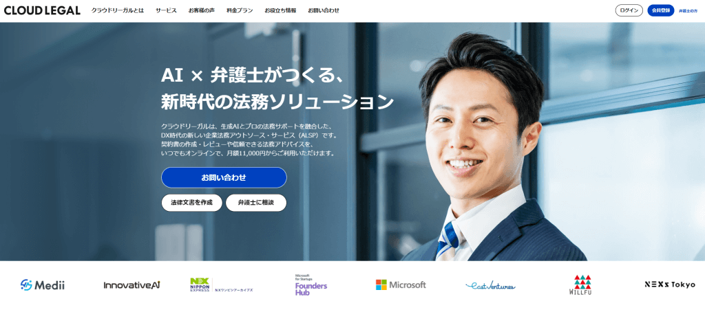 クラウドリーガルは、法務に関わる課題やお悩みを解決に導くサービスです。月額11,000円から、経験豊富な弁護士へ相談したり高精度AIを活用したりできます。