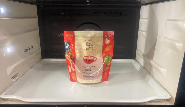 「Office Stand By You」の商品は、毎月宅配便でオフィスに届きます。企業の従業員は、食べたい商品をキャッシュレス決済で購入。商品をそのまま電子レンジで90秒温めるだけで、本格的なスープを味わえます。スープカップやスプーンも備品として付いているので、器やマグカップを持参する必要もありません。