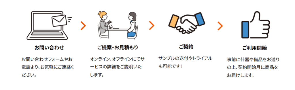 要お問い合わせ ※冷蔵庫・備品レンタル無料 ※2か月間は月額費用0円(5名以上の利用者が対象) ※送料無料の試食セットあり |