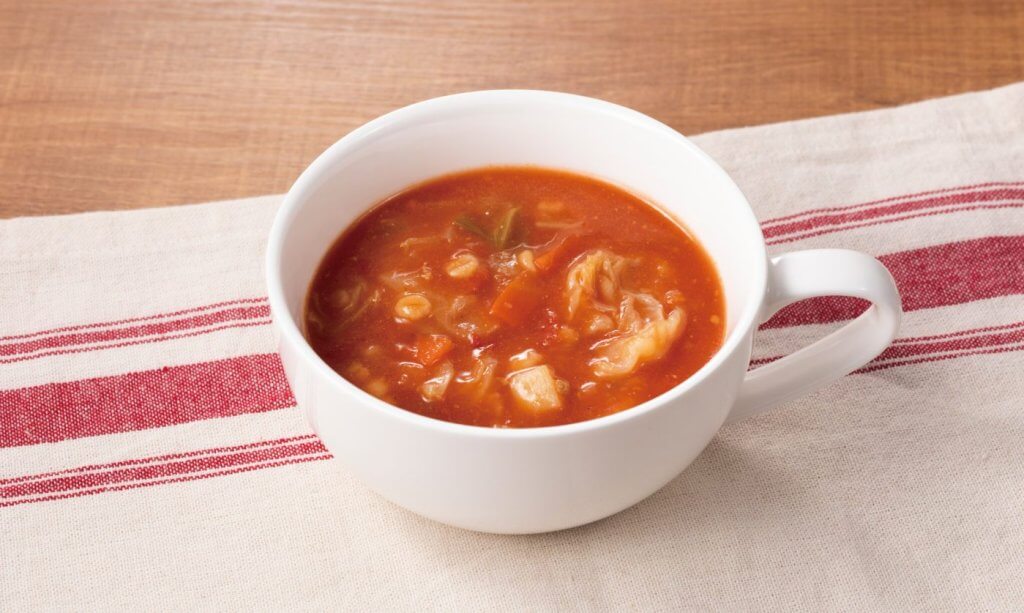 ![]() ミネストローネ | ・トマトやキャベツなど9種の具材と押し麦を使用 ・3分の1日分の野菜が取れる ・1食たったの113キロカロリー | エネルギー:113キロカロリー たんぱく質:5.4グラム 脂質:4.5グラム 炭水化物:12.8グラム 食塩相当量:1.3グラム | キャベツ/玉ねぎ/じゃがいも/にんじん/赤ピーマン/セロリ/ミズクワイ/クラッシュトマト/鶏肉 など |