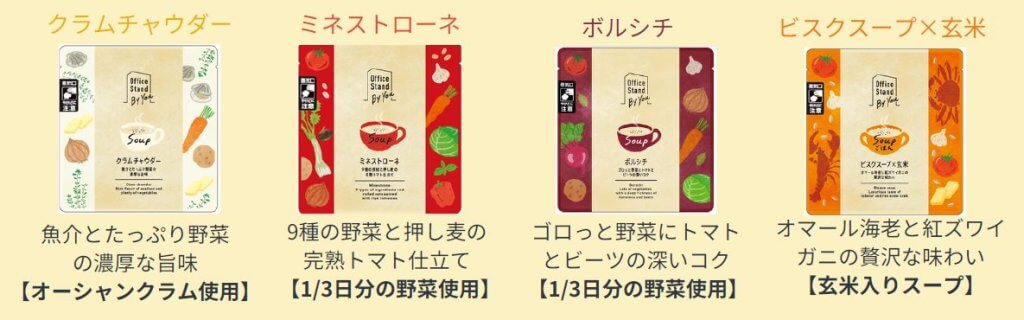 「Office Stand By You」のスープはオフィス専用商品です。コンビニエンスストアやスーパーマーケットなどでは購入できない豪華なスープを毎日手軽に味わえます。