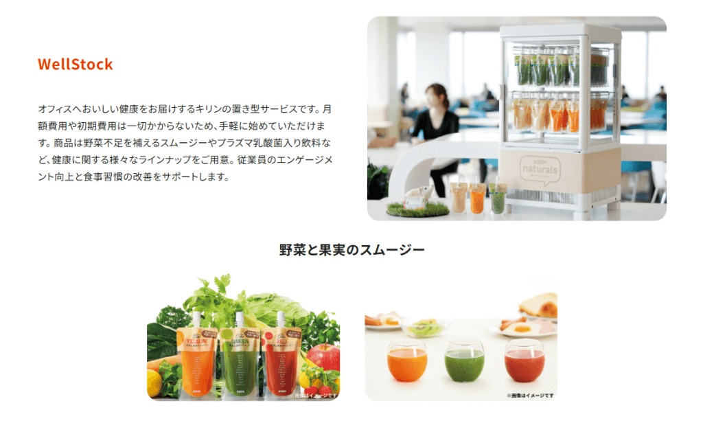 関連サービスとして野菜不足を補えるスムージーやプラズマ乳酸菌入り飲料などをオフィスに常備して、従業員が好きなタイミングで購入できる「WellStock」があります。月額費用や初期費用は一切かからないため、手軽に利用可能です。