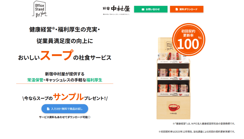 Office Stand By Youは、120年以上の歴史を持つ新宿中村屋が手掛けるオフィスコンビニサービスです。余計なものは入れずに、素材本来の旨味を引き出したレストラン品質の味わいのスープをオフィスで手軽に味わえます。