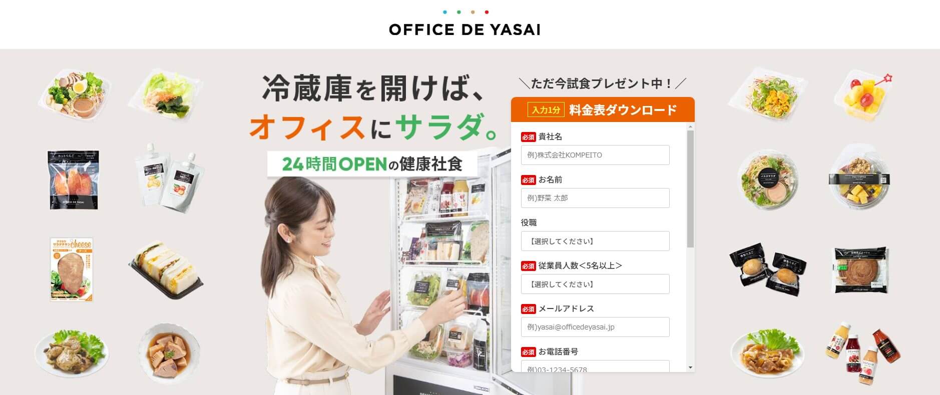 オフィスで野菜 詳細はこちら | –新鮮な野菜・フルーツ・総菜が100円~食べられる! 継続率は99.2% -毎月50種類以上レパートリーが変わる! 管理栄養士監修の健康的な食事を飽きずに楽しめる –2カ月間は月額利用料0円! 導入実績は1万拠点以上で10~1000名以上の企業に対応 | 要お問い合わせ ※冷蔵庫・備品レンタル無料 ※2か月間は月額費用0円(5名以上の利用者が対象) ※送料無料の試食セットあり | 日本全国 | 新鮮なサラダ・フルーツ 手作りのお惣菜など |
