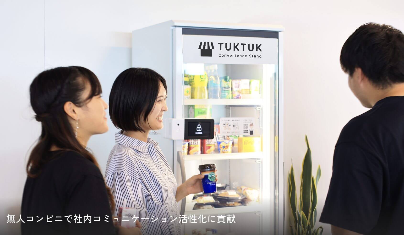 オフィスコンビニTUKTUK![]() 詳細はこちら | -お弁当・軽食・ドリンク・デザートまで幅広いラインナップを毎月更新! 定番商品から季節限定の新商品まで楽しめる -AIが販売データを分析、オフィスのニーズに合わせて適した商品を自動補充! 社員からのリクエストもアプリで簡単に受付可能 –スマートロックとカメラを搭載! 夜間や土日を含む24時間365日、いつでも利用できる -全国対応! 拠点間の福利厚生の公平化を図れる | 要お問い合わせ ※予算に合わせて選べる3つのプランを用意※要望に応じたカスタマイズも可能 | TUKTUK(自社配送):東京都・神奈川・埼玉・千葉(一部) TUKTUKmini(郵送):全国 | ・お弁当 ・パスタ ・チャーハン ・お惣菜 ・お菓子 ・ドリンク ・おにぎり ・パン ・ヨーグルト ・豆腐バー ・アイスクリームなど ※商品は300種類以上 |