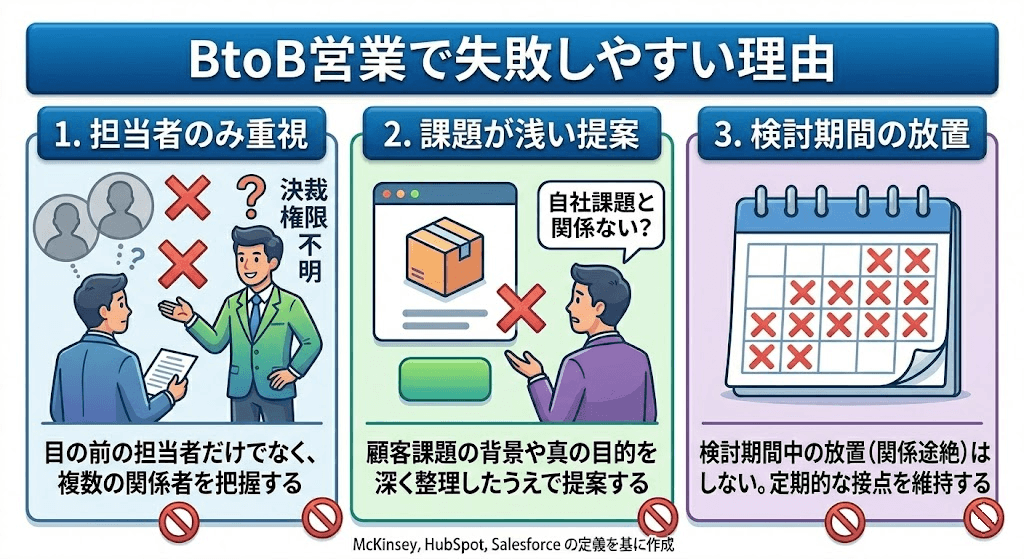 BtoB営業で失敗しやすいのは、目の前の担当者だけを見て進めることです。担当者が前向きでも、その人が社内で説明しやすい材料がなければ案件は止まりやすくなります。また、課題を浅く捉えたまま提案すると、表面的な商品説明に終わりやすく、導入の必要性が伝わりにくくなります。HubSpot が B2B sales で複数関係者と長い購買サイクルを挙げていることからも、この失敗は起こりやすいといえます。