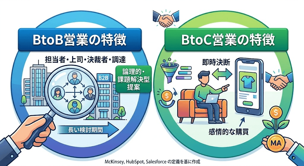 BtoB営業の特徴は、提案先が企業であり、実際にはその企業の担当者、上司、決裁者、調達部門など複数の関係者とやり取りしながら進むことです。HubSpot は B2B sales について、長い購買サイクルと複数ステークホルダーを伴うことが多いと説明しています。McKinsey も、B2B の購買行動では多様なチャネルと複数の関係者が関わる複雑な顧客体験が一般的だと指摘しています。