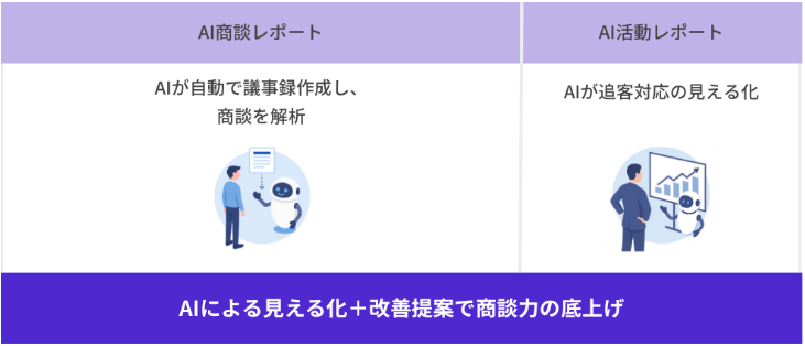 中堅企業においても高い定着率を誇り、AIによる商談要約や自動レポート機能など、データ活用を推進。シンプルなUIながらも拡張性が高く、組織拡大フェーズにも対応可能。