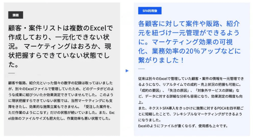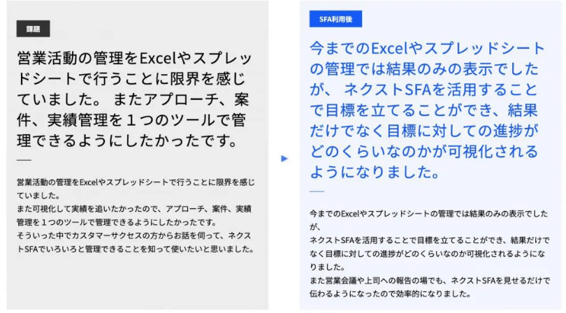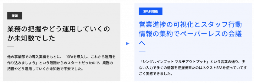 SFAツールの導入は、営業活動で直面しやすい課題解消に役立ちます。ネクストSFAの導入事例を通して、SFAツールが実際に企業でどのような課題解決に向けて活用され、どれほどの成果を出しているのか参考にしてみてください。