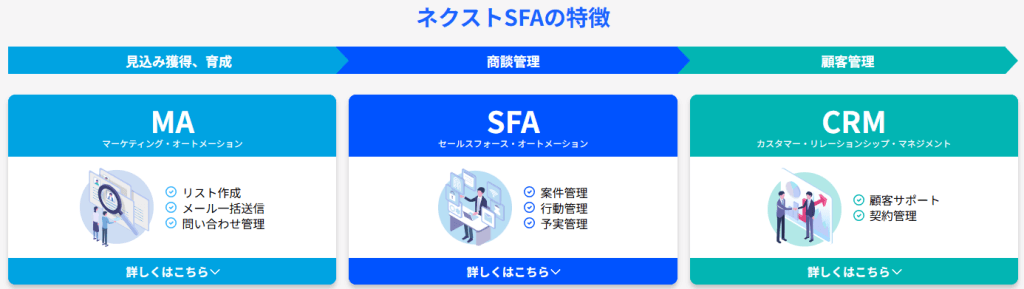 また、SFAは単体で使うだけでなく、CRM(顧客関係管理)やMA(マーケティング自動化)と連携することで、見込み獲得から育成、商談、受注、アフターフォローまでの顧客体験を統合的に管理できます。これにより、営業部門とマーケティング部門の連携が強化され、売上の最大化と顧客満足度の向上につながり、見込み獲得から受注、顧客維持までの流れを一元化できます。