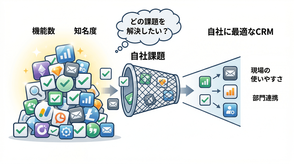 CRMを比較するとき、つい機能一覧や知名度の高い製品に目が向きがちです。