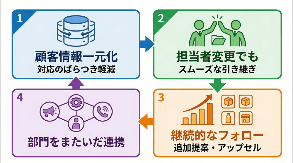 過去の接点や対応履歴を活かしながら、顧客との関係を深め、継続的な提案やフォローへつなげていくための基盤です。