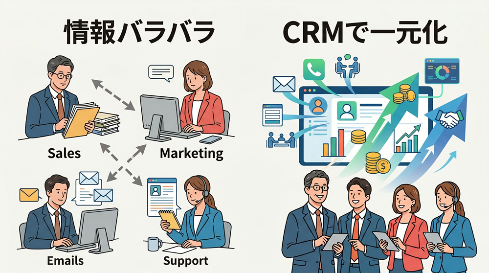 CRMは、こうした分断を減らして情報をつなげやすくする仕組みです。