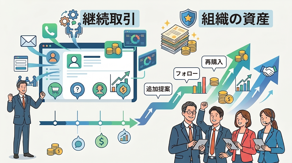 CRMは、顧客情報を保存するためだけの仕組みではありません。過去の接点、商談履歴、問い合わせ内容、購買履歴などを整理し、その情報を活かしながら顧客との関係を深め、継続的な提案や対応品質の向上につなげていくための土台です。